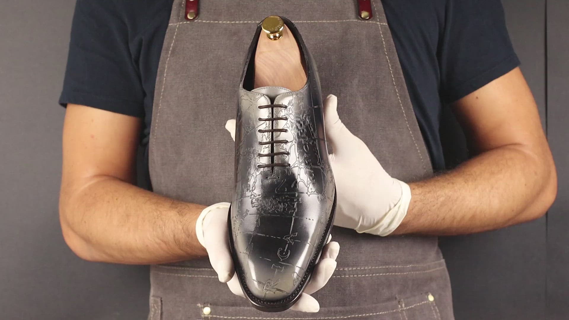 Goodyear welted pair of wholecut shoes, featuring an antique map illustration, which is laser engraved on the crust calf leather. The leather is hand painted and finished by our artisans with our grey reverse patina effect. The pair features a brown leather outsole, black inner lining and brown shoe laces. In terms of construction, they are made using the Savile shoe last: a soft chisel toe and a long elegant vamp.